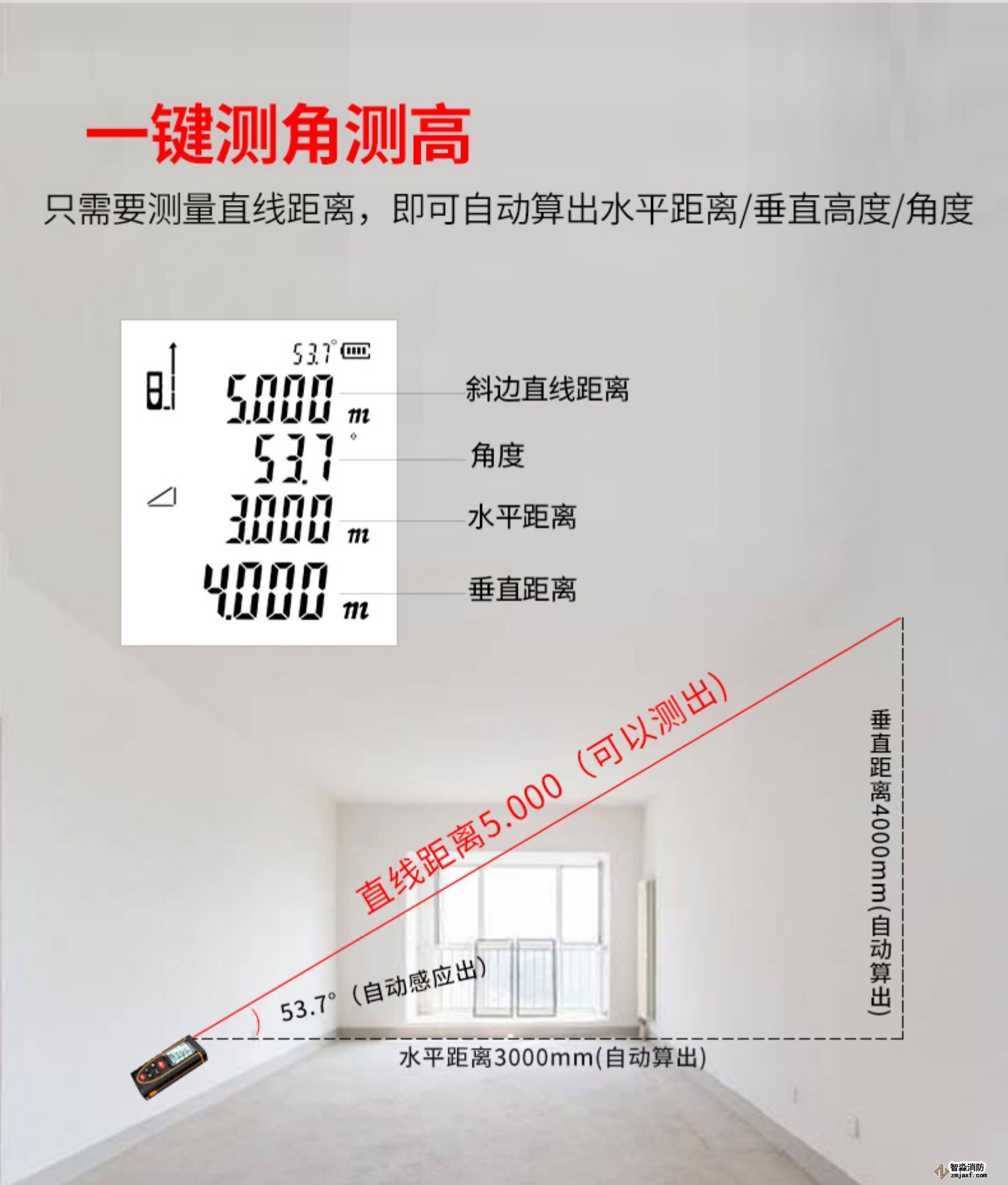 激光测距仪量程不小于50m;精度:3mm测量距离、面积、空间、体积